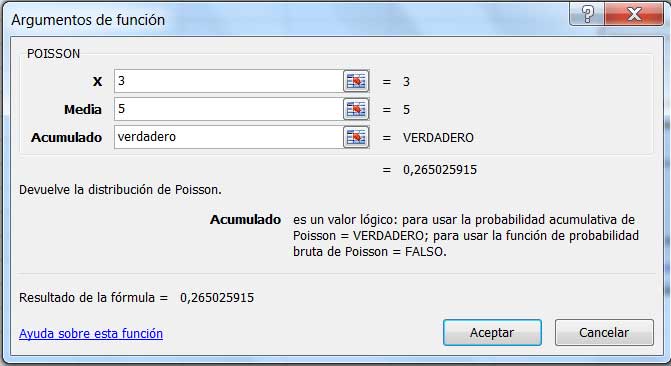 Una vez que hacemos clic en “Aceptar”, aparece la ventana que se observa en la imagen 5.13. Debemos entonces ingresar el valor de la variable aleatoria y el valor del parámetro (que en la ventana aparece indicado como “media”). Tal como nos sucediera con la ventana correspondiente a la distribución binomial, debemos, en último lugar, escribir “falso” en el casillero correspondiente a “Acumulado”, de modo de obtener la probabilidad de que se detecten exactamente tres partículas. De escribir “verdadero”, el resultado obtenido correspondería a la probabilidad de detectar tres o menos partículas durante un minuto (imagen 5.14).