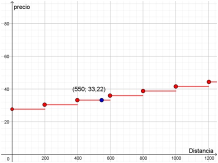 Como puede apreciarse en el gráfico siguiente, el punto azul corresponde a 550 metros de distancia recorrida y $33,22 que deberán abonarse.