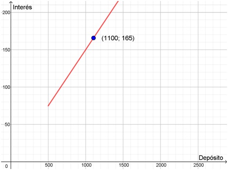 Para la representación gráfica se consideran los valores calculados en la tabla, pero los intereses no “saltan” (como en el ejercicio 1), sino que van ascendiendo en forma continua. En el gráfico siguiente se destacó, por ejemplo, el punto (1100; 165), que corresponde a un depósito de $1100, que al cabo de 30 días cobrará $165 de interés.
