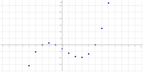 Cuando se grafica “con lápiz, regla y calculadora” esta función, es importante recordar que tiene tres tramos que no se pueden unir porque la x no puede tomar el valor -1, ni el valor 5.