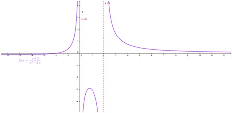 Al graficar es importante recordar que el gráfico no pasará por los valores de x = 0 y x = 2. Para enfatizar esta cuestión se presenta la tabla anterior en tres “tramos”, porque el gráfico también tendrá tres tramos.