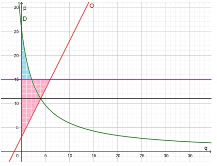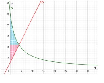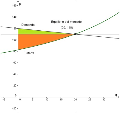 En el siguiente gráfico, se representó a la oferta en color rojo y a la demanda en color verde. También se graficó el precio de equilibrio. En color celeste se pintó la región correspondiente al excedente del consumidor y en rosa el excedente del productor: