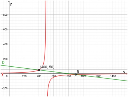- Precio de equilibrio: $50, cantidad de equilibrio: 400 unidades. Hay otro punto de intersección de las funciones, pero corresponde a un precio negativo.