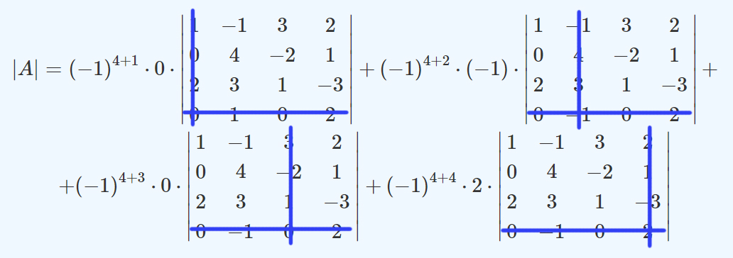 Otro ejemplo: el elemento \(c_{34}\) se encuentra en el cruce de la fila 3 de \(A\) con la columna 4 de \(B\). Se calcula entonces como: \(c_{34}=0\cdot0\ +\ \left(-1\right)\cdot\left(-2\right)=0+2=2\) , es decir, al primer elemento de la fila 3 de A se lo multiplica por el primer elemento de la columna 4 de \(B\) y se le suma el producto entre el segundo elemento de la fila 3 de \(A\) y el segundo de la columna 4 de \(B\).